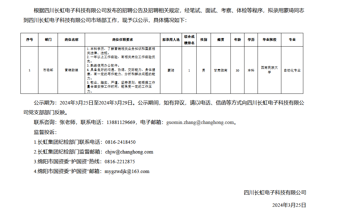 四川長虹電子科技有限公司關(guān)于招聘營銷助理擬錄用人員的公示