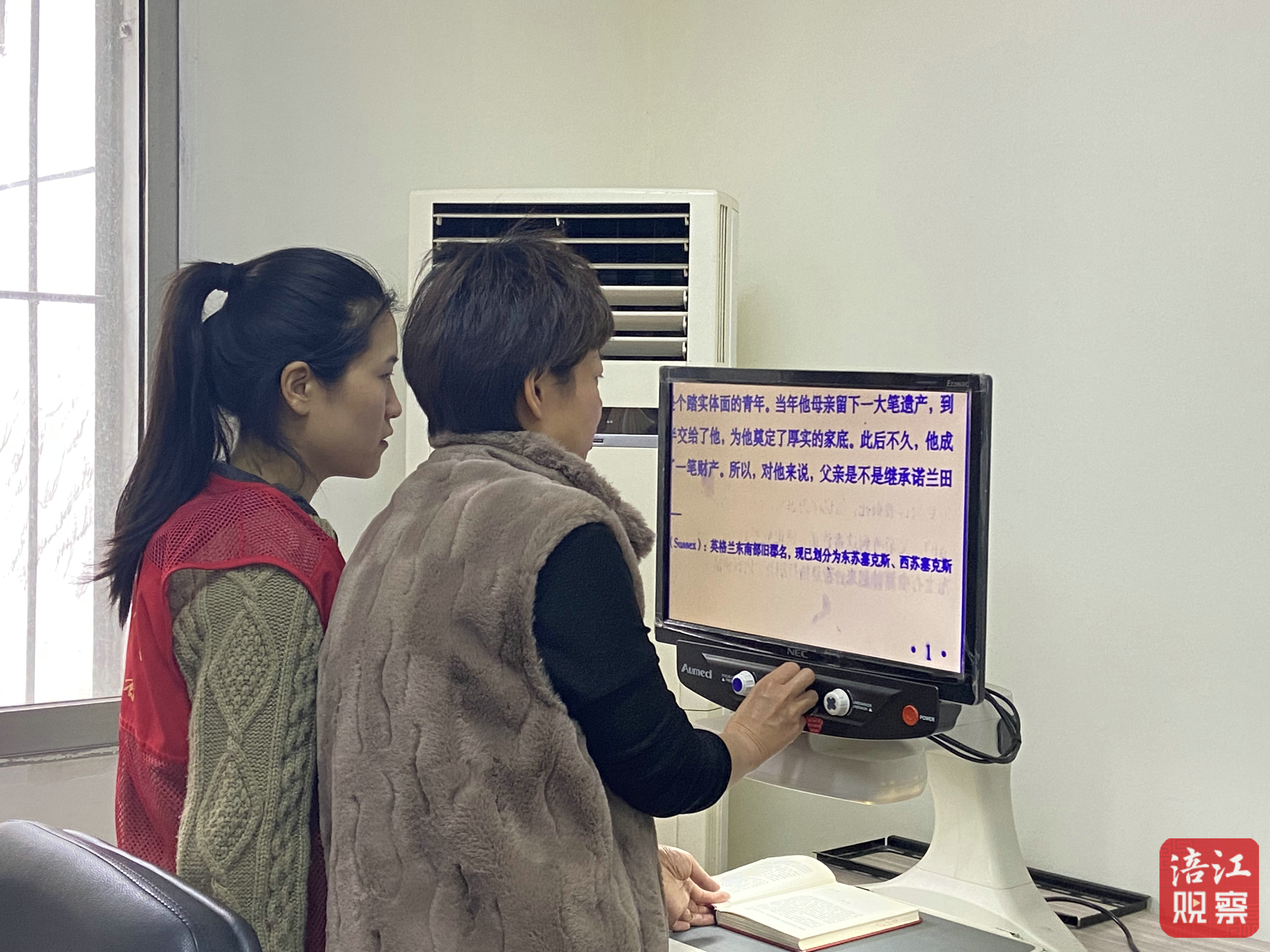 順著李春蘭指的方向,視障讀者姚瑜正在市圖書館工作人員的幫助下,往右扭動(dòng)助視儀的旋鈕,將《理智與情感》一書的文字放大。“之前看書都是自帶放大鏡,有了這款助視儀就方便多了,翻頁也很簡(jiǎn)單,對(duì)我們低視力人士很友好。”姚瑜邊操作邊告訴記者。