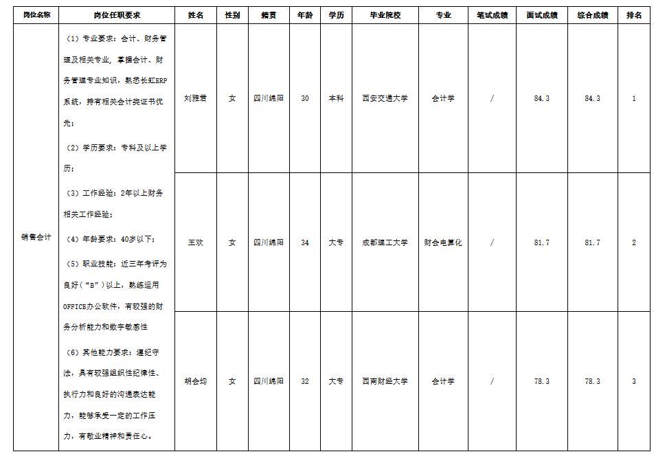 根據(jù)四川愛創(chuàng)科技有限公司-財(cái)務(wù)管理部發(fā)布的招聘公告及招聘相關(guān)規(guī)定,經(jīng)面試,現(xiàn)將面試成績予以公示。