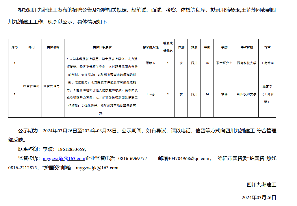 四川九洲建工關于招聘經營管理崗擬錄用人員的公示