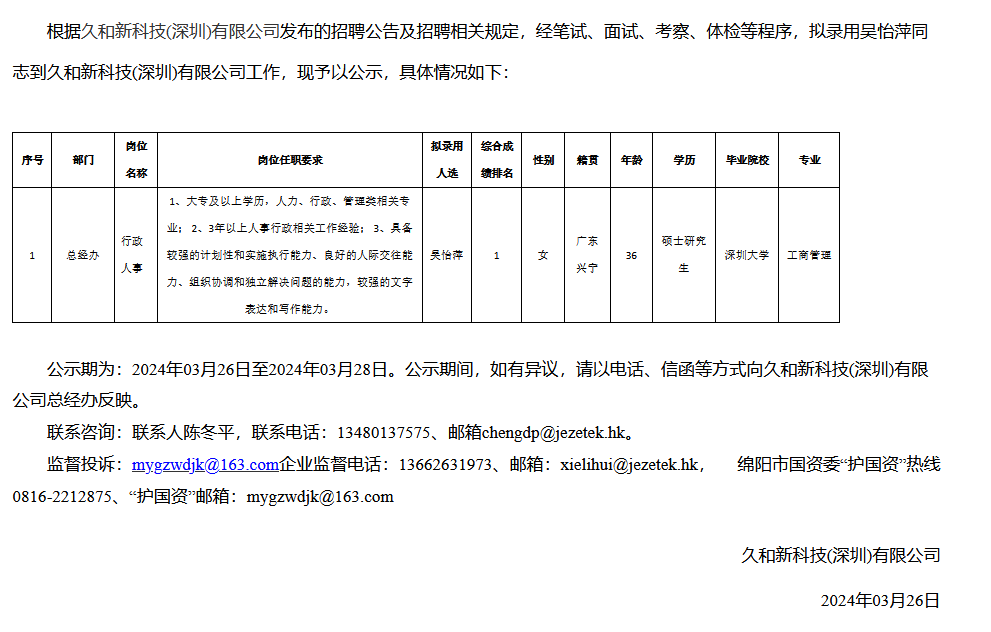 久和新科技(深圳)有限公司關于招聘行政人事崗擬錄用人員的公示