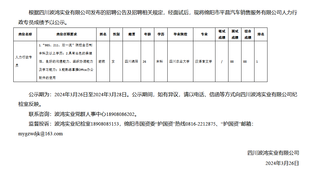 四川波鴻實(shí)業(yè)有限公司關(guān)于招聘綿陽(yáng)市平昌汽車(chē)銷售服務(wù)有限公司人力行政專員成績(jī)的公示