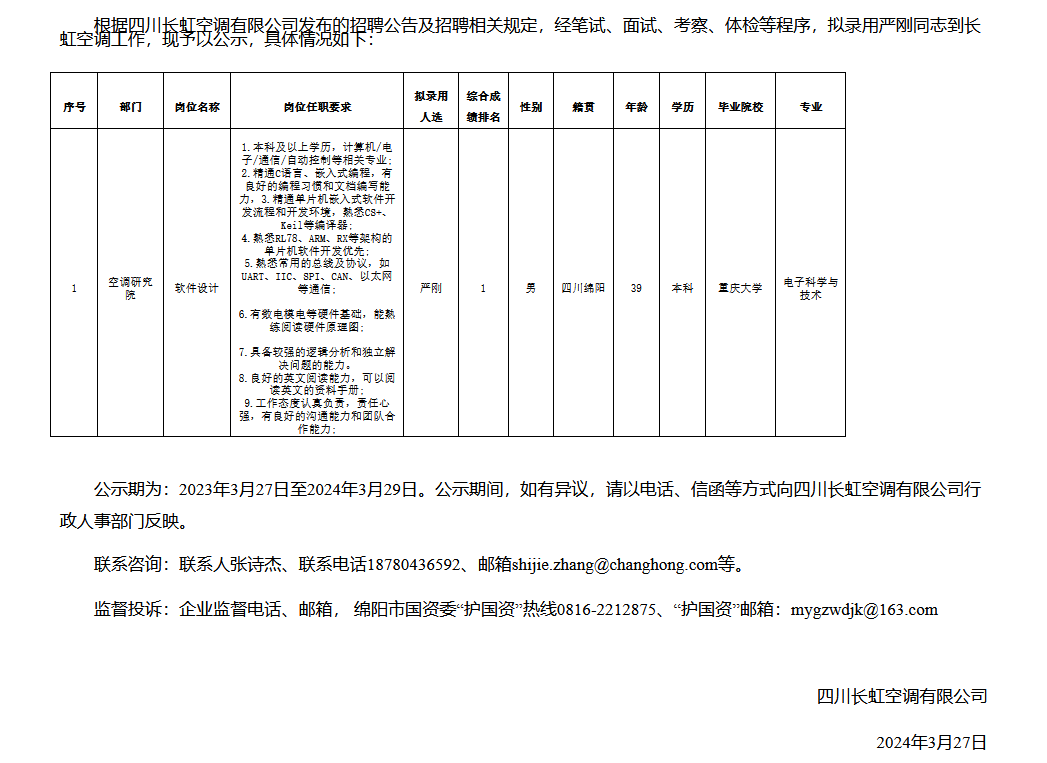 四川長虹空調(diào)有限公司關(guān)于招聘軟件設(shè)計(jì)崗位擬錄用人員的公示