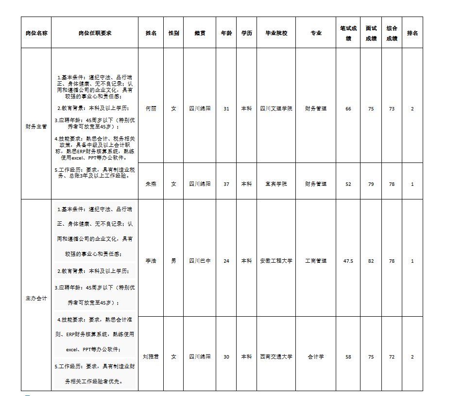 根據(jù)四川長虹空調(diào)有限公司發(fā)布的招聘公告及招聘相關(guān)規(guī)定,經(jīng)筆試、面試等程序,現(xiàn)將筆試(面試)成績予以公示。