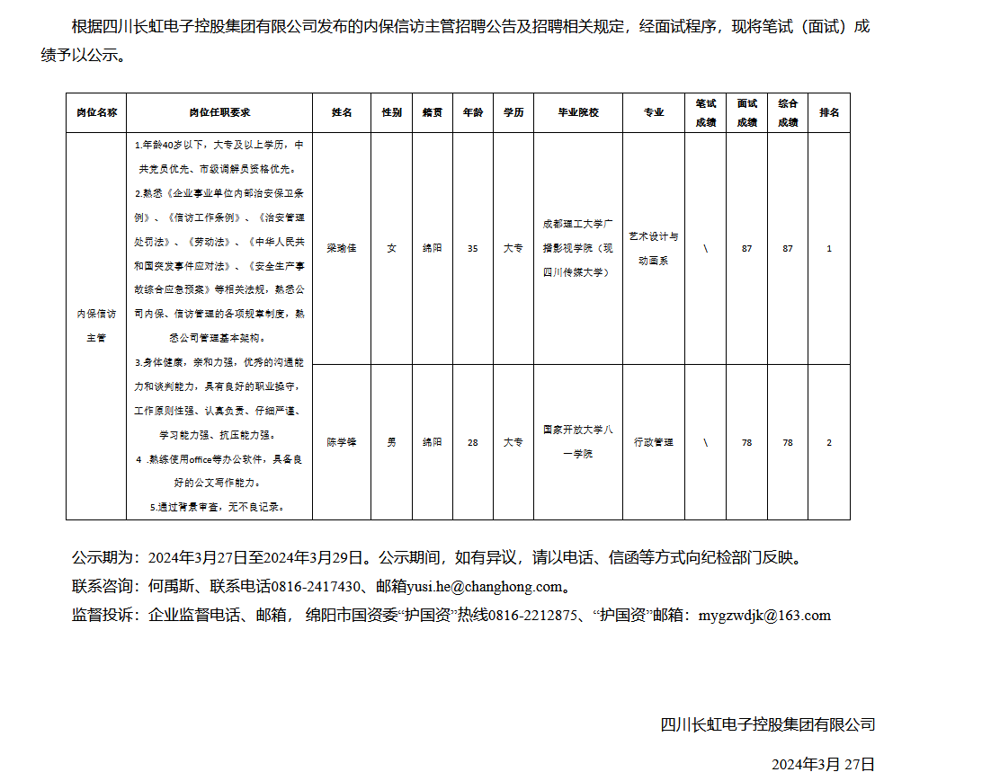 四川長虹電子控股集團(tuán)有限公司關(guān)于招聘內(nèi)保信訪主管測試成績的公示