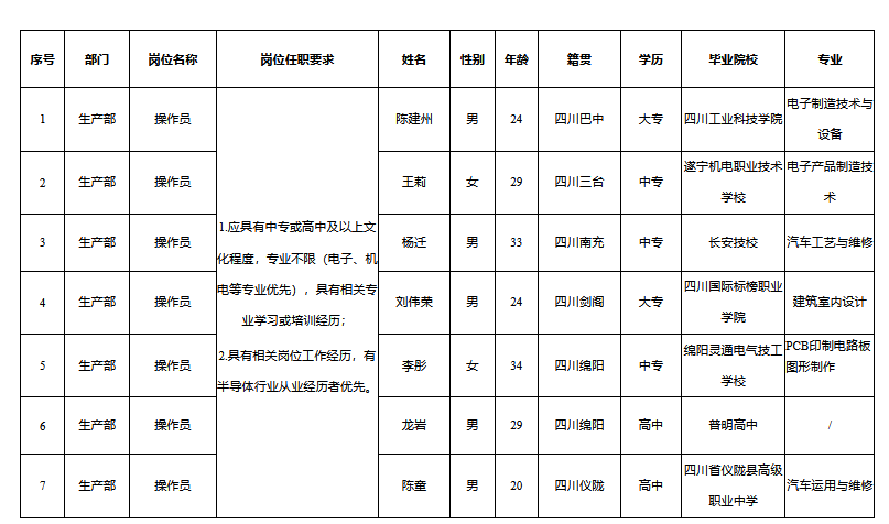 根據(jù)四川啟賽微電子公司發(fā)布的招聘公告及招聘相關(guān)規(guī)定,從2024年3月1日至2024年3月26日,經(jīng)面試、考察、體檢等程序,錄用以下7名同志到操作職崗位工作,現(xiàn)予以公示,具體情況如下: