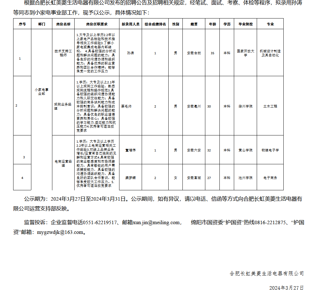 合肥長虹美菱生活電器有限公司關(guān)于招聘技術(shù)支持工程師等崗位擬錄用人員的公示