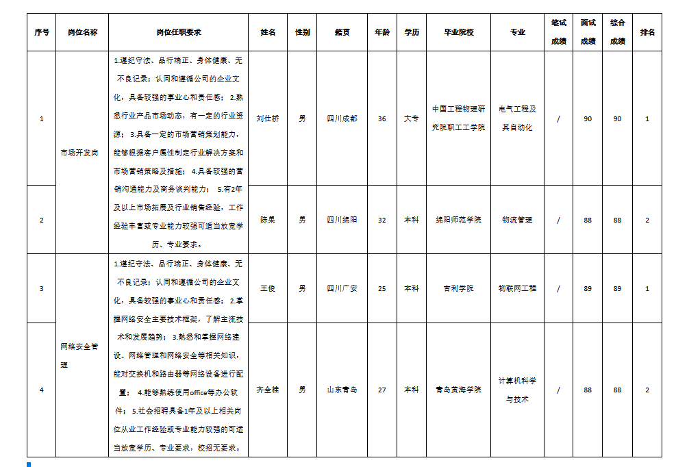 根據(jù)四川九強通信科技有限公司發(fā)布的招聘公告及招聘相關(guān)規(guī)定,經(jīng)筆試、面試等程序,現(xiàn)將筆試(面試)成績予以公示。