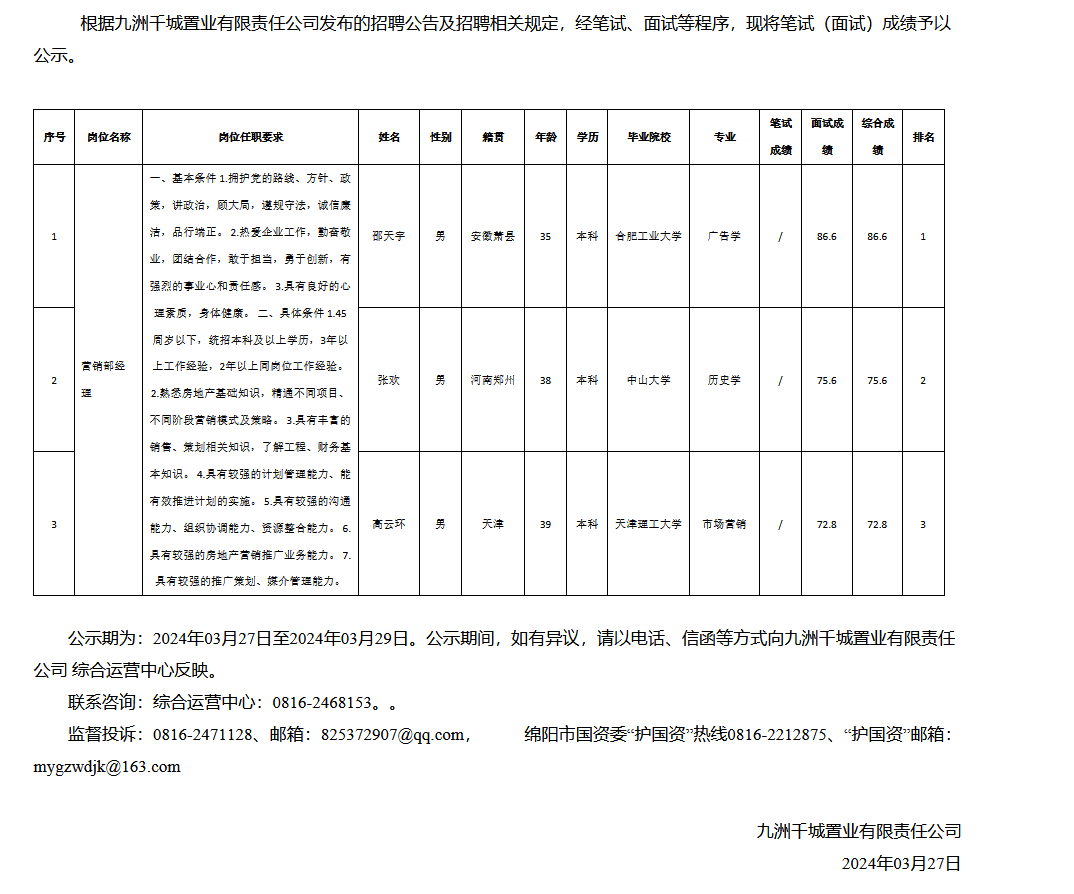 九洲千城置業(yè)有限責(zé)任公司關(guān)于招聘庫爾勒九洲千城置業(yè)有限責(zé)任公司營銷部經(jīng)理測試成績的公示