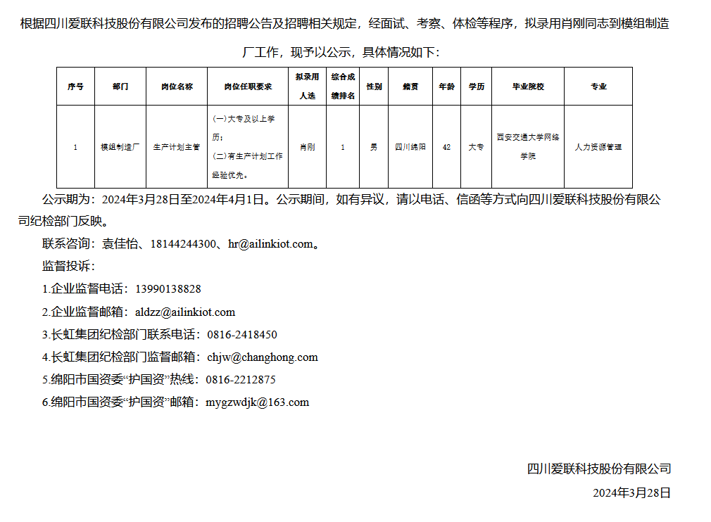 四川愛聯(lián)科技股份有限公司關(guān)于招聘生產(chǎn)計(jì)劃主管崗位擬錄用人員的公示