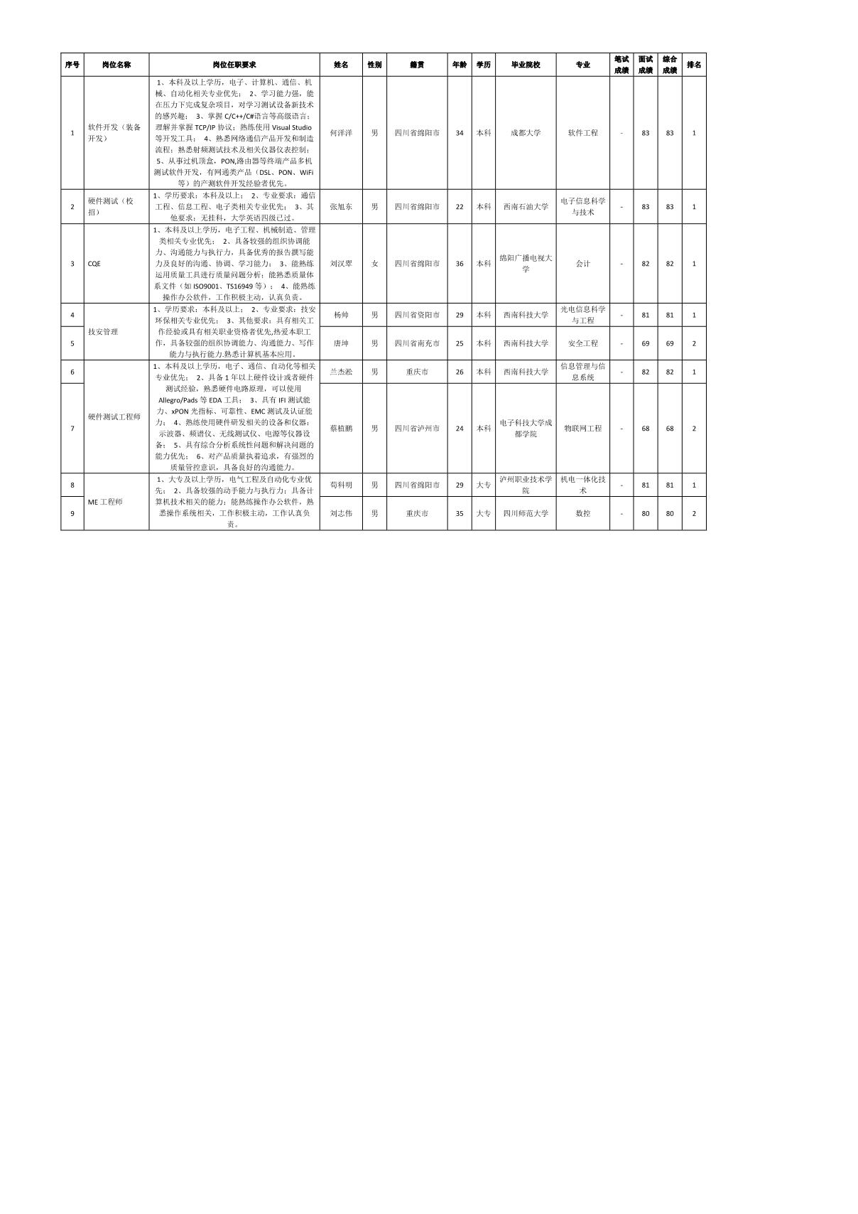 根據(jù)四川九州電子科技股份有限公司發(fā)布的招聘公告及招聘相關(guān)規(guī)定,經(jīng)筆試、面試等程序,現(xiàn)將筆試(面試)成績(jī)予以公示。