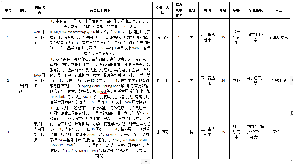 根據四川湖山電器股份有限公司發(fā)布的招聘公告及招聘相關規(guī)定,經筆試、面試、考察、體檢等程序,擬錄用張津威,陳仕杰,胡佳升同志到四川湖山電器股份有限公司工作,現予以公示,具體情況如下: