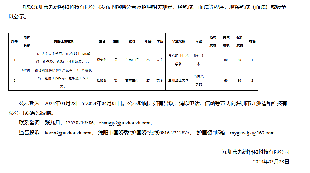 深圳市九洲智和科技有限公司關(guān)于招聘MC崗測(cè)試成績的公示