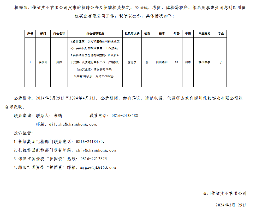 四川佳虹實(shí)業(yè)有限公司關(guān)于招聘操作職擬錄用人員的公示