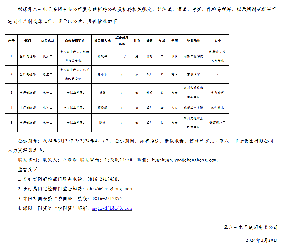 零八一電子集團有限公司關(guān)于招聘機加工等崗位擬錄用人員的公示