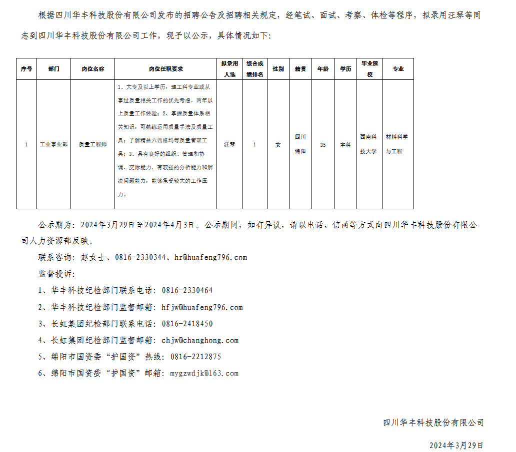 四川華豐科技股份有限公司關(guān)于招聘質(zhì)量工程師擬錄用人員的公示