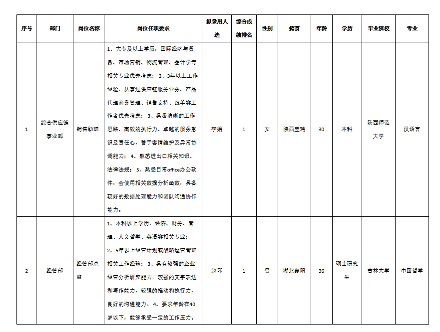 根據(jù)久和新科技(深圳)有限公司發(fā)布的招聘公告及招聘相關(guān)規(guī)定,經(jīng)筆試、面試、考察、體檢等程序,擬錄用趙環(huán),李娟同志到久和新科技(深圳)有限公司工作,現(xiàn)予以公示,具體情況如下:
