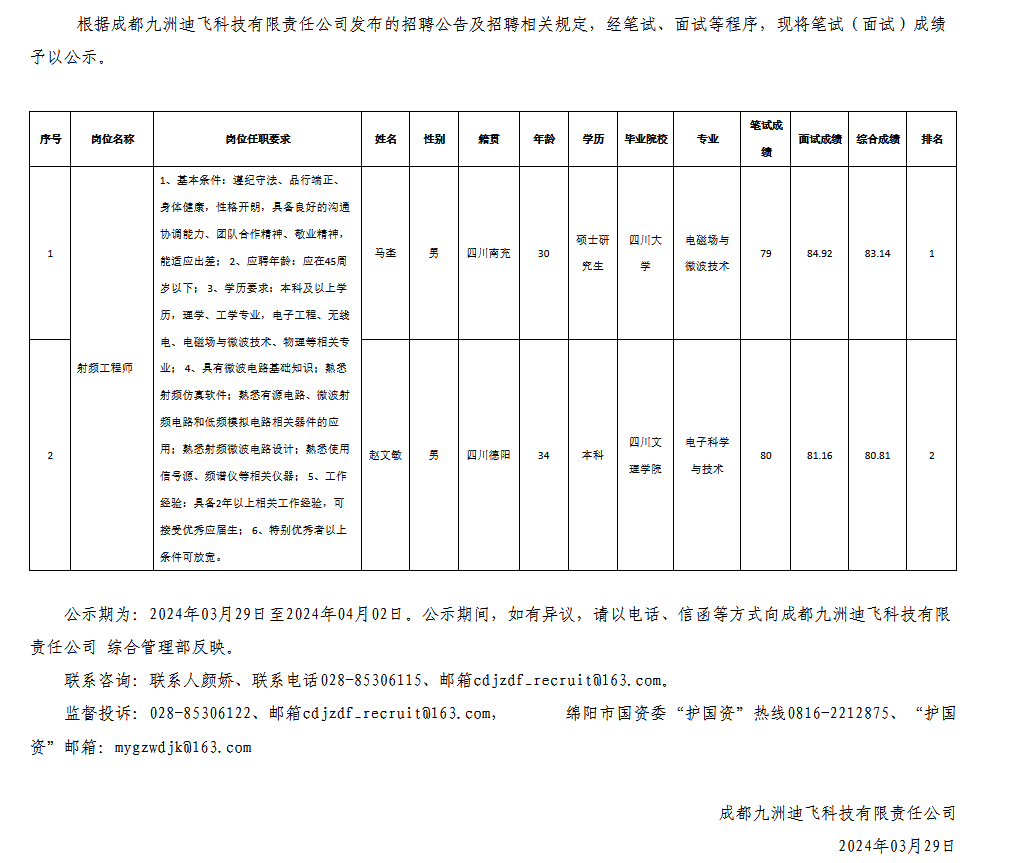 成都九洲迪飛科技有限責(zé)任公司關(guān)于招聘射頻工程師崗位測(cè)試成績(jī)的公示