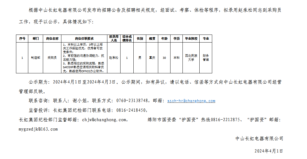 中山長虹電器有限公司關(guān)于招聘采購員崗位擬錄用人員的公示