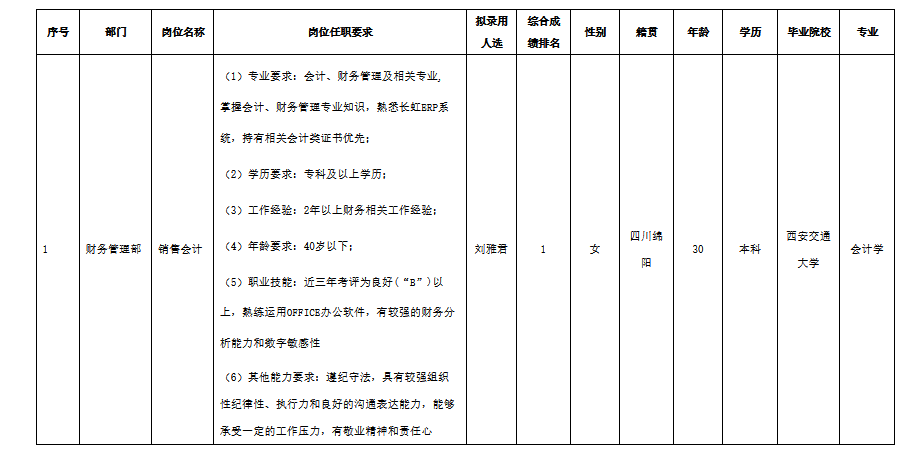 根據(jù)四川愛創(chuàng)科技有限公司發(fā)布的招聘公告及招聘相關(guān)規(guī)定,經(jīng)面試、考察、體檢等程序,擬錄用劉雅君同志到財(cái)務(wù)管理部工作,現(xiàn)予以公示,具體情況如下:
