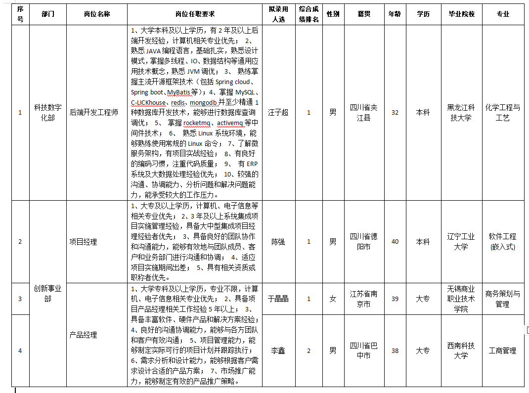 根據(jù)四川科瑞軟件有限責(zé)任公司發(fā)布的招聘公告及招聘相關(guān)規(guī)定,經(jīng)筆試、面試、考察、體檢等程序,擬錄用陳強(qiáng),于晶晶,李鑫,汪子超同志到四川科瑞軟件有限責(zé)任公司工作,現(xiàn)予以公示,具體情況如下: