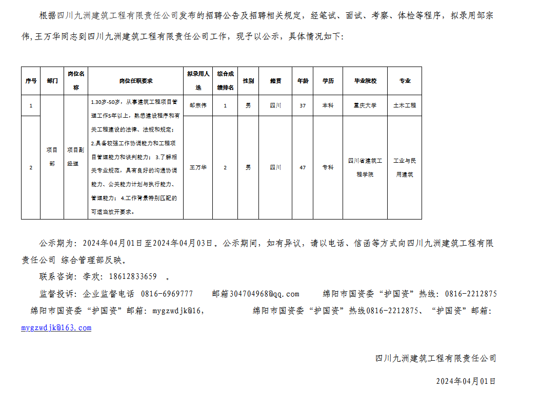 四川九洲建筑工程有限責任公司關(guān)于招聘項目副經(jīng)理擬錄用人員的公示