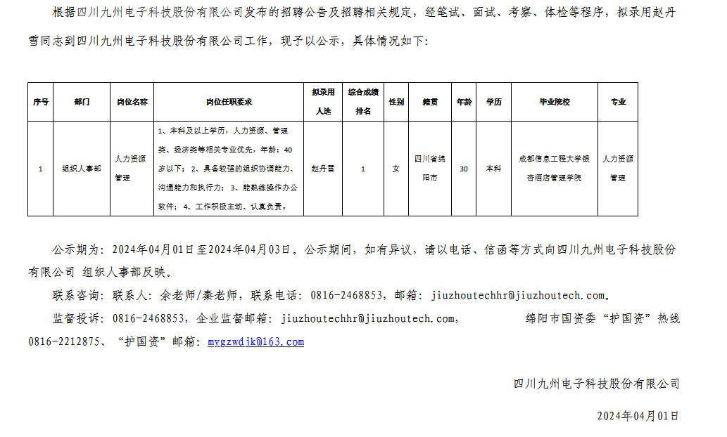 四川九州電子科技股份有限公司關(guān)于招聘人力資源管理擬錄用人員的公示