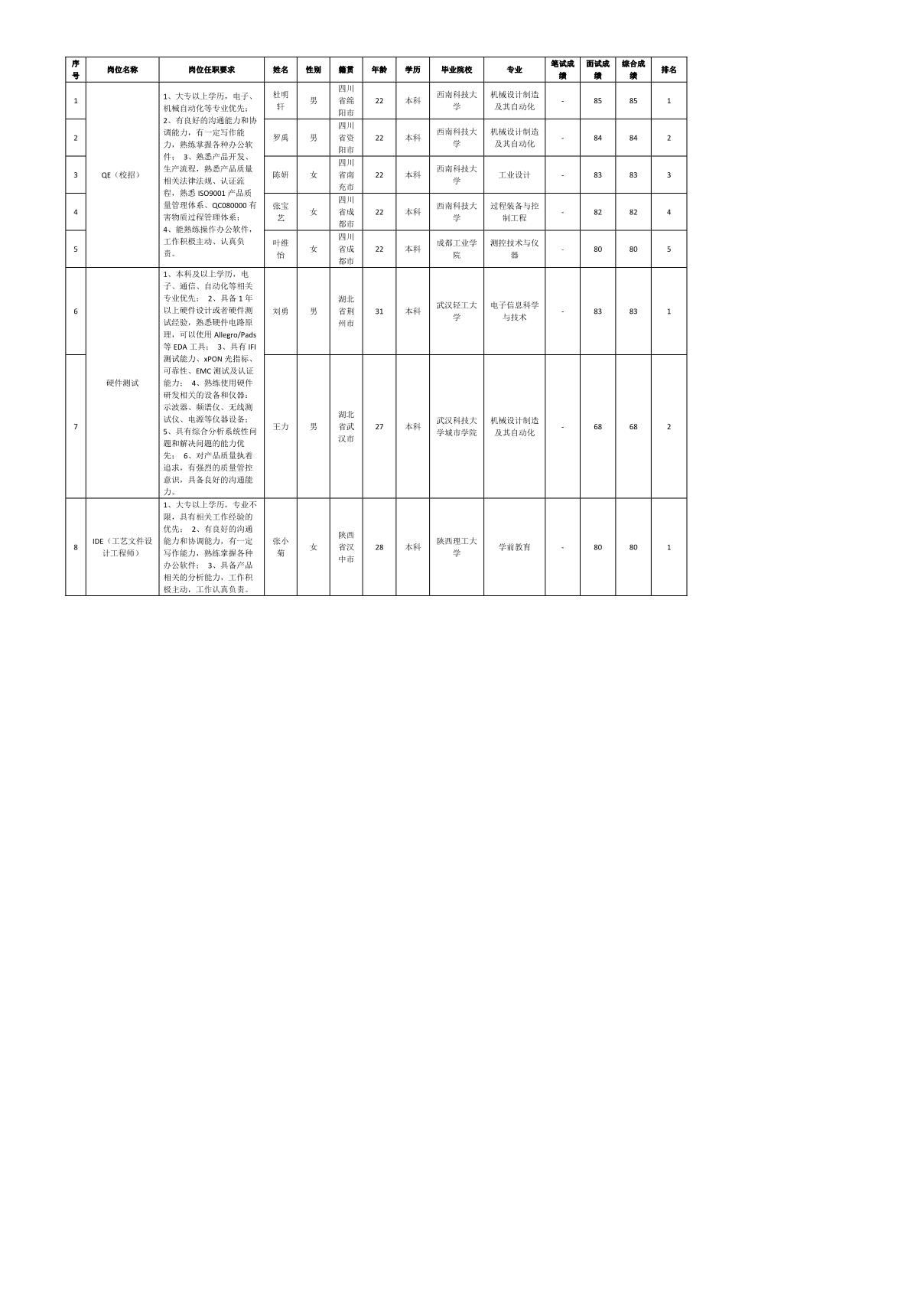 根據(jù)四川九州電子科技股份有限公司發(fā)布的招聘公告及招聘相關(guān)規(guī)定,經(jīng)筆試、面試等程序,現(xiàn)將筆試(面試)成績(jī)予以公示。
