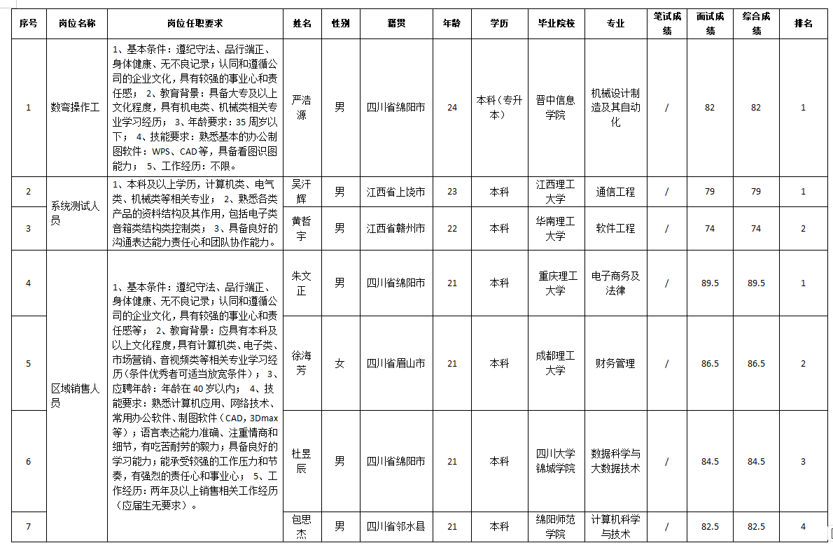 根據(jù)四川湖山電器股份有限公司發(fā)布的招聘公告及招聘相關(guān)規(guī)定,經(jīng)筆試、面試等程序,現(xiàn)將筆試(面試)成績(jī)予以公示。