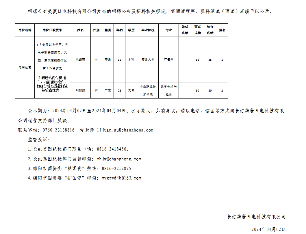 長虹美菱日電科技有限公司關(guān)于招聘電商運營崗位測試成績的公示