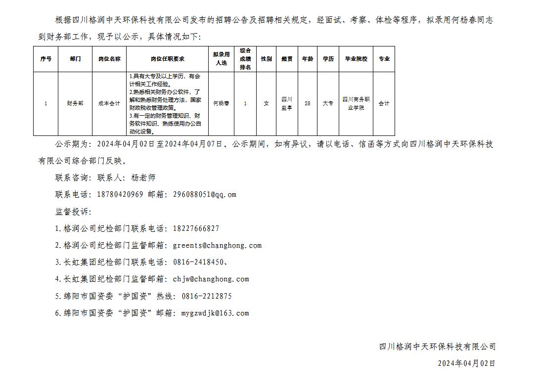 四川格潤中天環(huán)??萍加邢薰娟P于招聘成本會計崗位擬錄用人員的公示