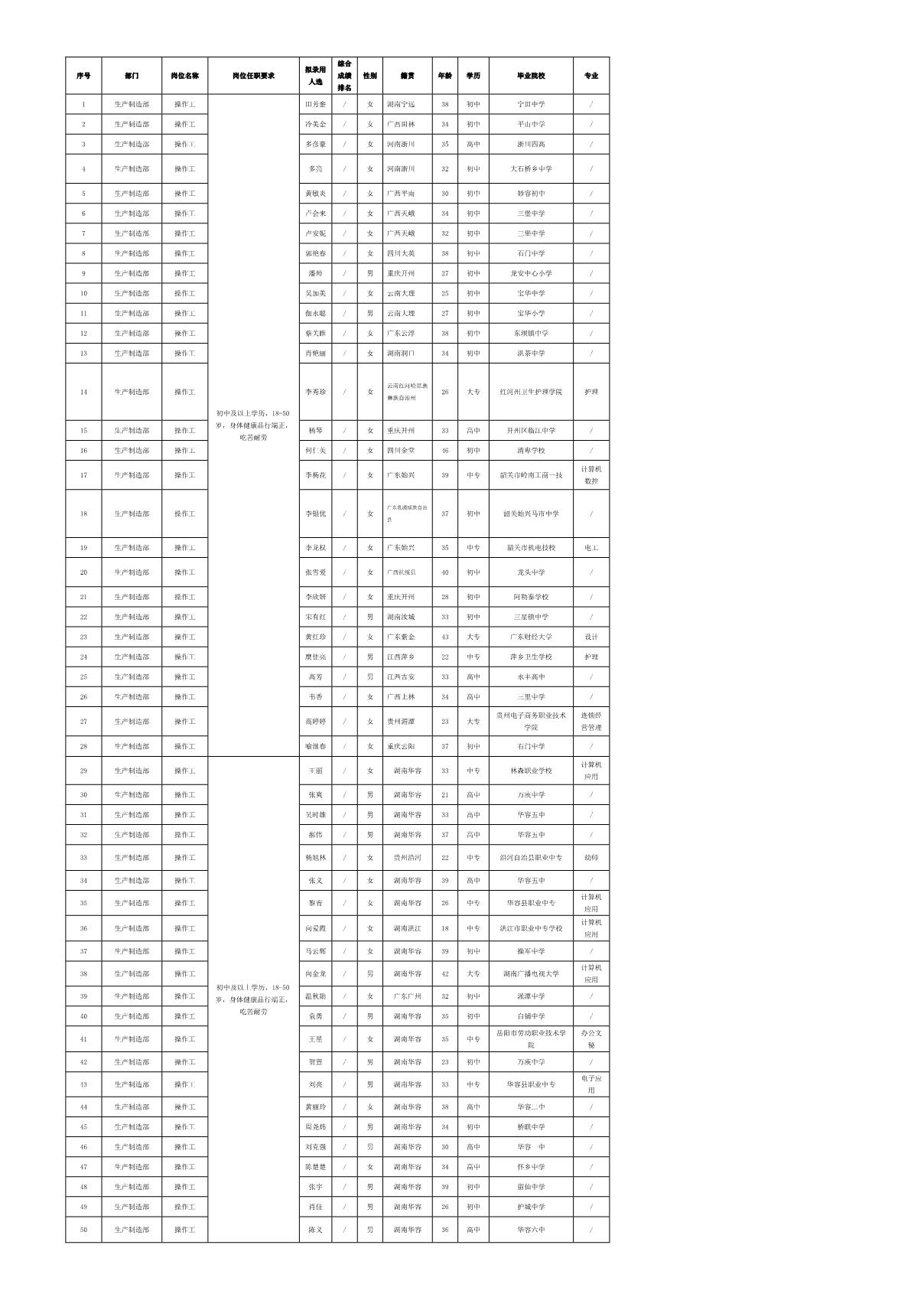 根據(jù)深圳長(zhǎng)虹聚和源科技有限公司發(fā)布的招聘公告及招聘相關(guān)規(guī)定,經(jīng)筆試、面試、考察、體檢等程序,擬錄用以下同志到公司生產(chǎn)制造部工作,現(xiàn)予以公示,具體情況如下: