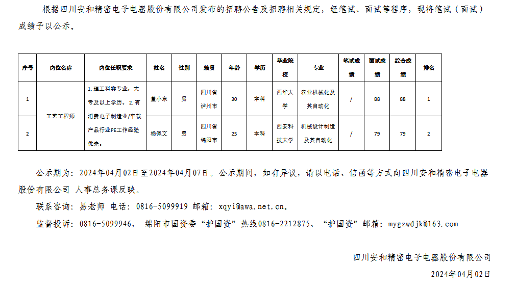 四川安和精密電子電器股份有限公司關(guān)于招聘工藝工程師測試成績的公示