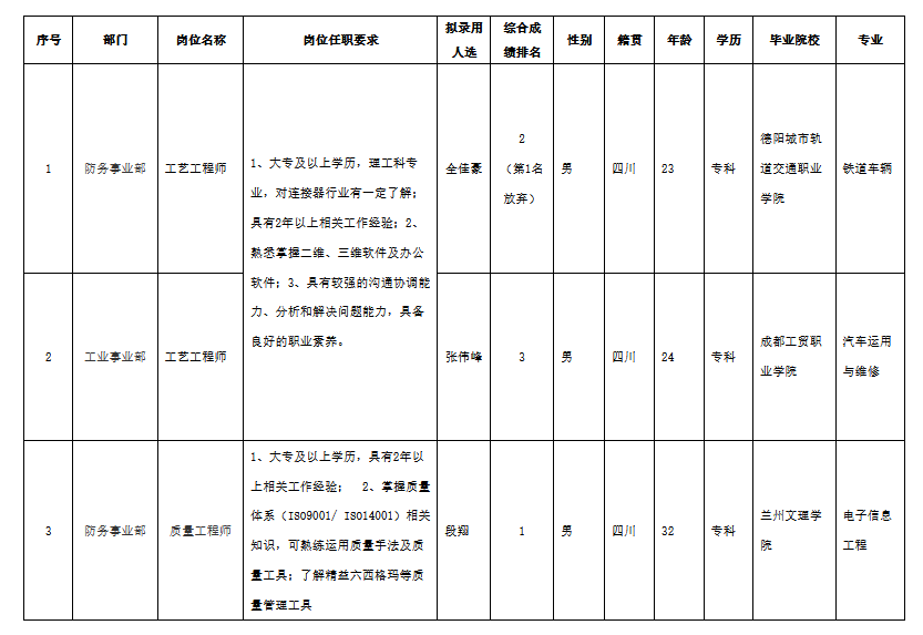 根據(jù)四川華豐科技股份有限公司發(fā)布的招聘公告及招聘相關(guān)規(guī)定,經(jīng)筆試、面試、考察、體檢等程序,擬錄用全佳豪等同志到四川華豐科技股份有限公司工作,現(xiàn)予以公示,具體情況如下: