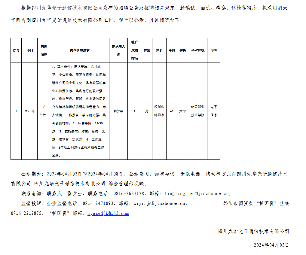 四川九華光子通信技術(shù)有限公司關(guān)于招聘生產(chǎn)主管擬錄用人員的公示