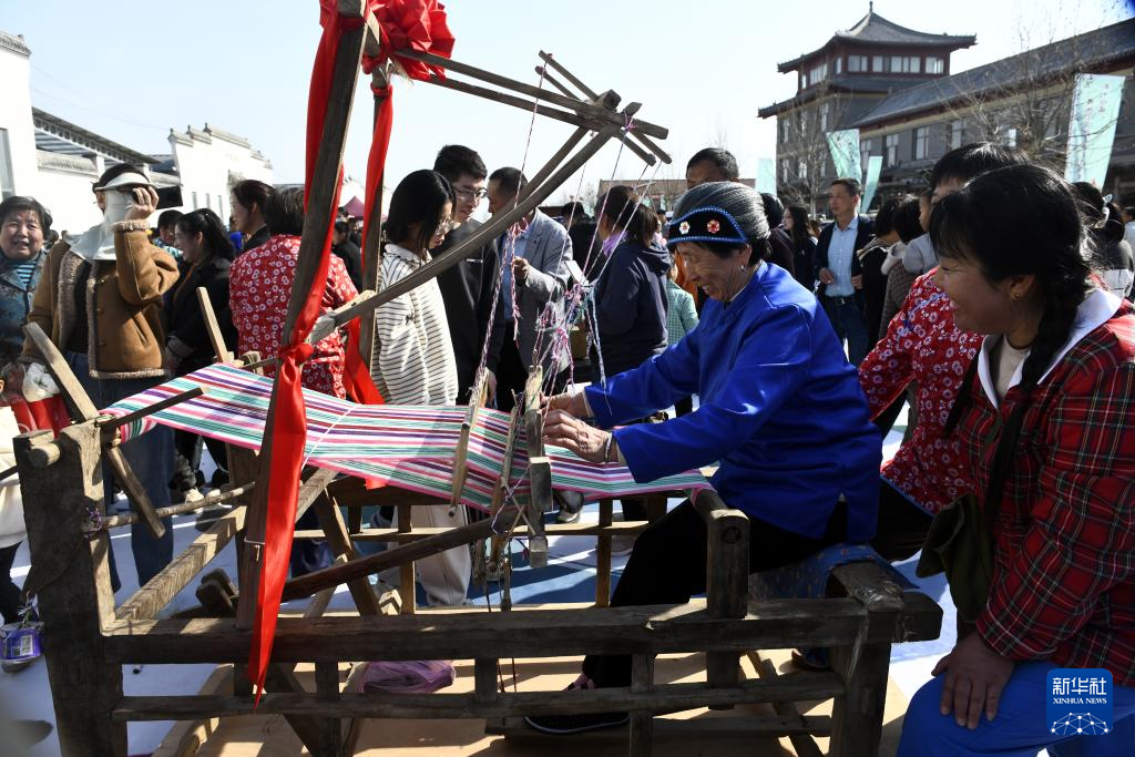 4月4日,水落坡鎮(zhèn)鄉(xiāng)村社火隊隊員在演繹魯北鄉(xiāng)村的老粗布織布場景。