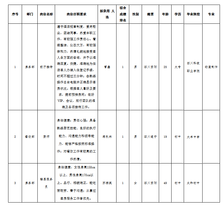 根據(jù)四川泰蒙斯酒店有限責任公司發(fā)布的招聘公告及招聘相關規(guī)定,經(jīng)筆試、面試、考察、體檢等程序,擬錄用曹鑫、蔣秋林、蘇瓊英等三位同志到泰蒙斯酒店工作,現(xiàn)予以公示,具體情況如下: