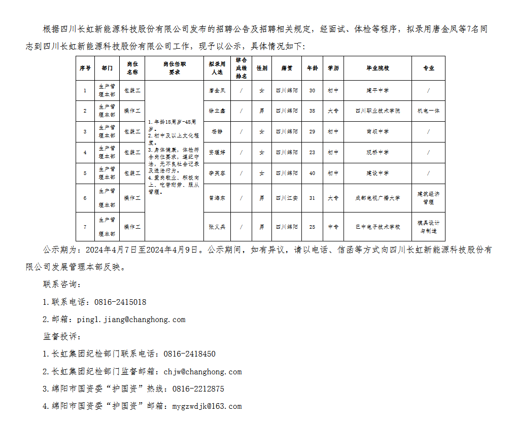 四川長虹新能源科技股份有限公司關(guān)于招聘操作職員工擬錄用人員的公示