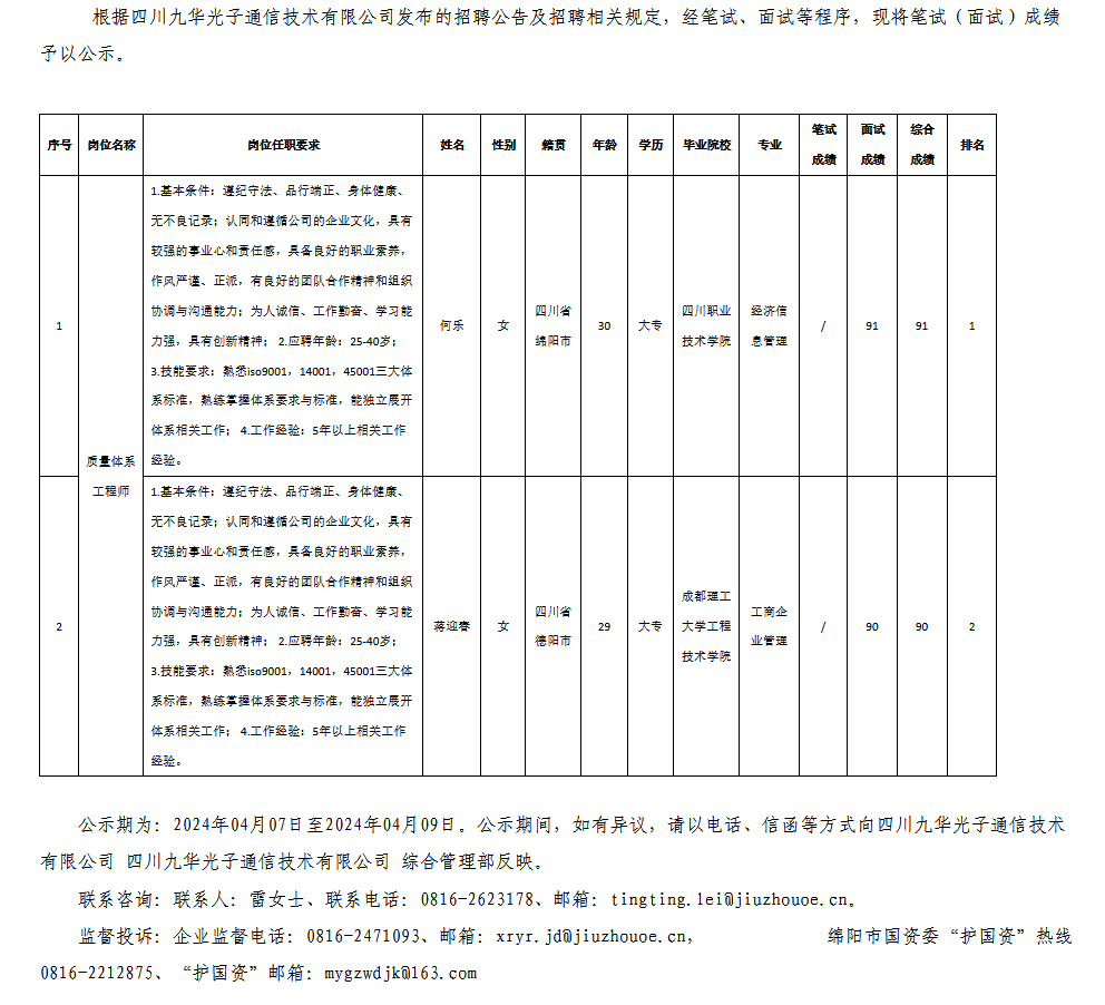 四川九華光子通信技術(shù)有限公司關(guān)于招聘質(zhì)量體系工程師測(cè)試成績(jī)的公示