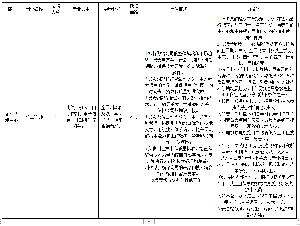 成都微精電機股份公司始建于1958年,是國家“一五”期間156項重點工程之一,2005年完成企業(yè)改制,現(xiàn)位于成都市東三環(huán)路二段龍?zhí)缎陆?jīng)濟產(chǎn)業(yè)功能區(qū)航天路12號。公司是國家專精特新“小巨人”企業(yè)、國務(wù)院國資委“科改行動”企業(yè)、中國電子元件行業(yè)協(xié)會微特電機與組件分會副理事長單位、全國信息產(chǎn)業(yè)用微特電機及組件標(biāo)準(zhǔn)化委員會委員單位、全國微電機標(biāo)準(zhǔn)化技術(shù)委員會委員單位,是國家高新技術(shù)企業(yè),建有四川省企業(yè)技術(shù)中心,擁有完備的科研生產(chǎn)資質(zhì),獲得了ISO9001質(zhì)量體系認(rèn)證。公司主要從事微特電機及組件的研制、開發(fā)、生產(chǎn)及銷售業(yè)務(wù),主要產(chǎn)品有力矩電機、旋轉(zhuǎn)變壓器、伺服電機、軸流風(fēng)機、伺服驅(qū)動器、特種泵以及機電一體化裝備等,共19個大類、66個系列、2000多個品種。產(chǎn)品主要用于為航空、航天、船舶重工、兵器、核工業(yè)、電子系統(tǒng)等配套,作為系統(tǒng)的執(zhí)行或反饋元件,產(chǎn)品和技術(shù)達(dá)到了國內(nèi)先進水平。公司曾先后3次獲得中共中央、國務(wù)院的表彰賀電,獲得中國首次載人航天飛行獎狀、省級先進企業(yè)、部級優(yōu)質(zhì)產(chǎn)品等榮譽。 為貫徹落實人才強企戰(zhàn)略,強化新一輪改革發(fā)展的干部人才支撐,廣開視野選拔優(yōu)秀管理人才加入企業(yè)改革發(fā)展工作,經(jīng)研究,成都微精電機股份公司(以下簡稱“微精公司”)決定面向社會公開選聘公司總工程師。微精公司情況詳見官網(wǎng)http://cemc-motor.com/。