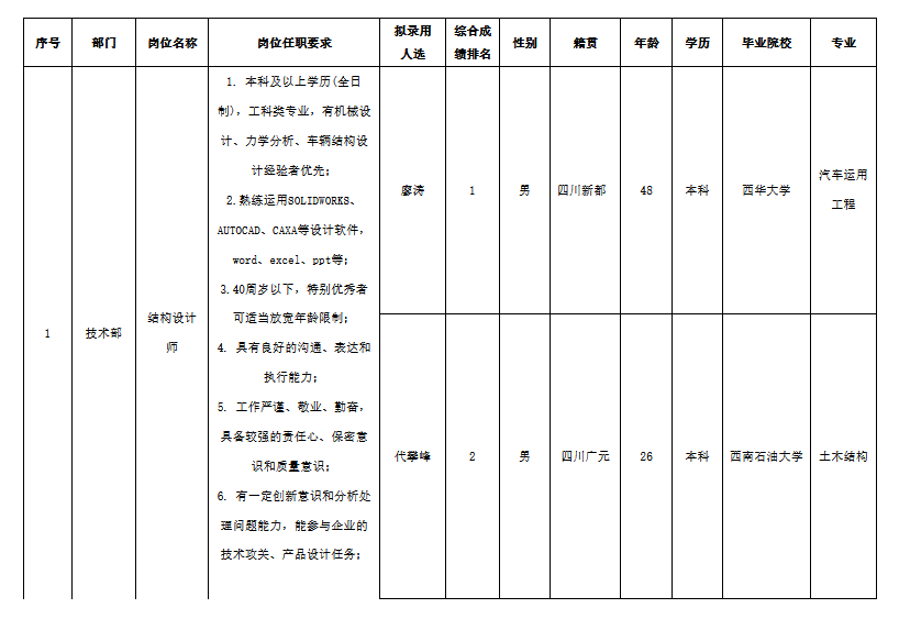 根據(jù)零八一電子集團(tuán)四川紅輪機(jī)械有限公司發(fā)布的招聘公告及招聘相關(guān)規(guī)定,經(jīng)筆試、面試、考察、體檢等程序,擬錄用廖濤等同志到公司辦工作,現(xiàn)予以公示,具體情況如下: