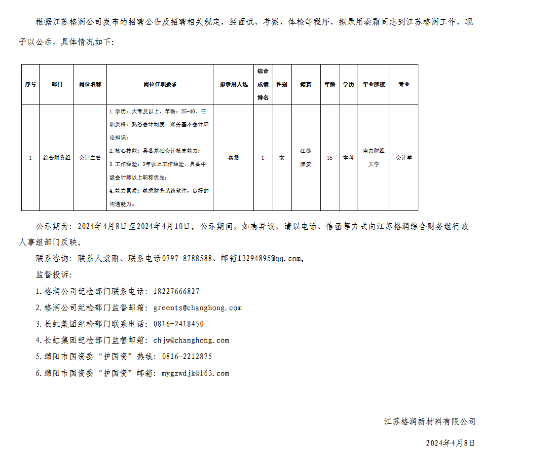 江蘇格潤(rùn)新材料有限公司關(guān)于招聘會(huì)計(jì)主管崗位擬錄用人員的公示