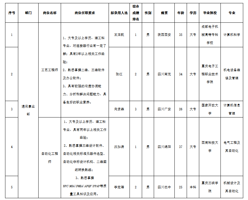 根據(jù)四川華豐科技股份有限公司發(fā)布的招聘公告及招聘相關規(guī)定,經(jīng)筆試、面試、考察、體檢等程序,擬錄用王龍凱同志到四川華豐科技股份有限公司工作,現(xiàn)予以公示,具體情況如下: