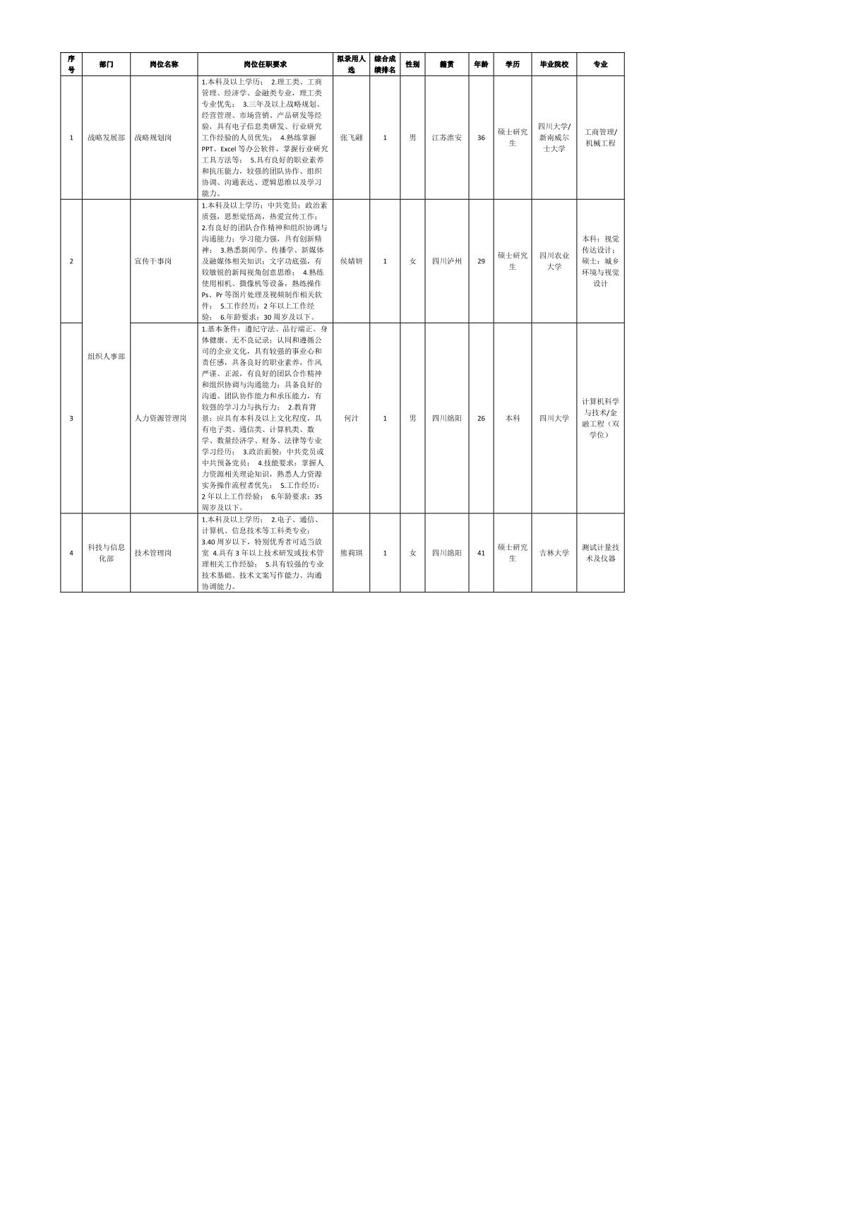 根據(jù)四川九州投資控股集團(tuán)有限公司發(fā)布的招聘公告及招聘相關(guān)規(guī)定,經(jīng)筆試、面試、考察、體檢等程序,擬錄用張飛翮,侯婧妍,何汁,熊莉琪同志到四川九州投資控股集團(tuán)有限公司工作,現(xiàn)予以公示,具體情況如下: