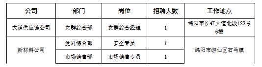 四川大道致遠(yuǎn)供應(yīng)鏈管理有限責(zé)任公司(以下簡(jiǎn)稱大道供應(yīng)鏈公司)是綿陽(yáng)交通發(fā)展集團(tuán)有限責(zé)任公司旗下全資子公司,成立于2021年1月,注冊(cè)資本2900萬(wàn)元,業(yè)務(wù)范圍覆蓋建筑用鋼筋產(chǎn)品銷售、水泥銷售、石油制品銷售等。綿陽(yáng)交發(fā)大道新材料科技有限責(zé)任公司(以下簡(jiǎn)稱新材料公司)是大道供應(yīng)鏈公司旗下全資子公司,成立于2021年11月,主營(yíng)業(yè)務(wù)為廢舊瀝青再生技術(shù)研發(fā)與瀝青砼生產(chǎn)貿(mào)易?,F(xiàn)因公司經(jīng)營(yíng)發(fā)展需要,經(jīng)研究決定面向社會(huì)公開招聘,具體招聘情況如下: