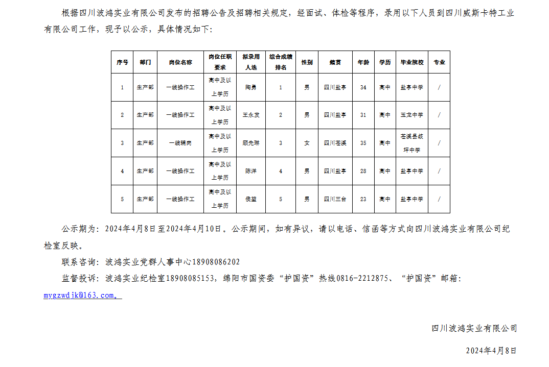 四川波鴻實(shí)業(yè)有限公司關(guān)于3月招聘四川威斯卡特工業(yè)有限公司一線崗位擬錄用人員的公示