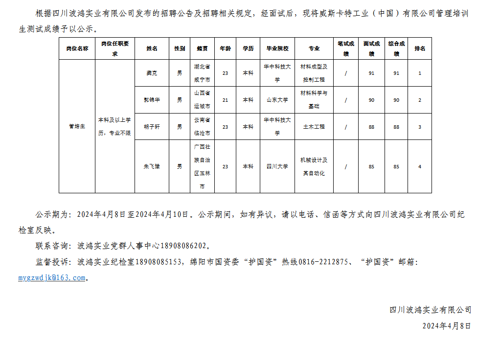 四川波鴻實業(yè)有限公司關(guān)于招聘威斯卡特工業(yè)(中國)有限公司管培生測試成績的公示