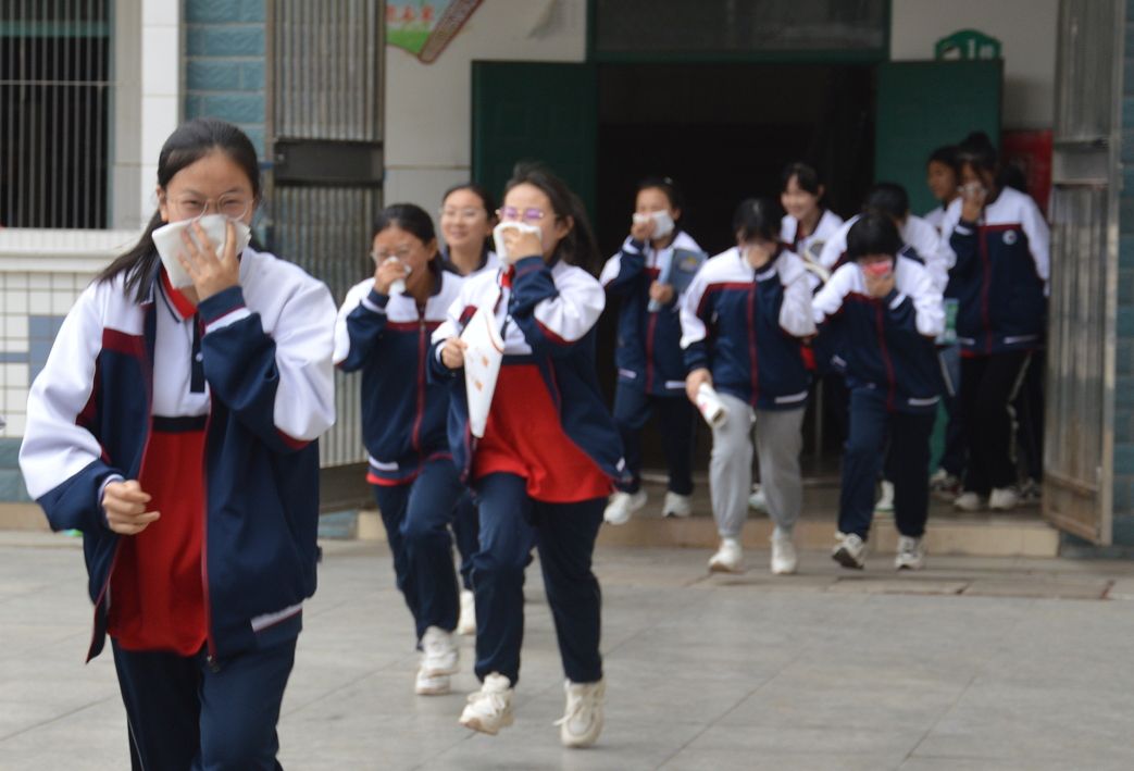 消防演練警報響起后,所有學(xué)生用毛巾或紙巾捂住口鼻,在教師指揮下有序撤離寢室。等所有學(xué)生集中到指定位置后,各班班主任再次清點報告人數(shù)。