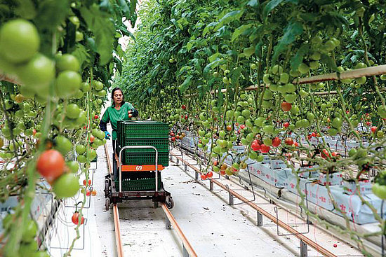 2月11日,在四川省眉山市東坡區(qū)西南智慧農(nóng)業(yè)產(chǎn)業(yè)園,工作人員在采摘無(wú)土栽培的番茄。姚永亮攝/《了望》新聞周刊