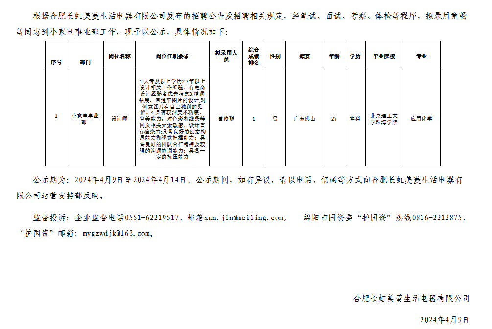 合肥長虹美菱生活電器有限公司關(guān)于招聘設計師擬錄用人員的公示